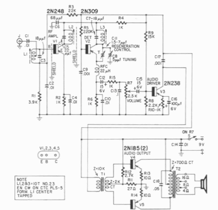Encontrado numa documentação de Hugo Gernsback de 1960, este receptor usa transistores de germânio da época e tem saída em alto-falante.