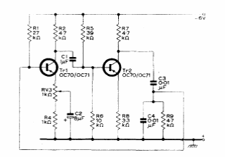 Este oscilador com ponte de Viena fornece um sinal senoidal de 3 a 4 kHz. O circuito foi encontrado num manual de Mullard de 1960. Os transistores são da época.