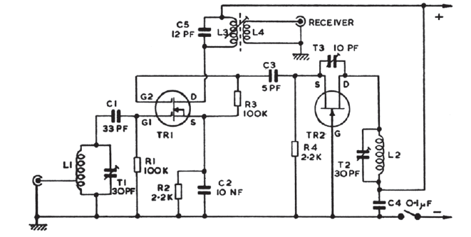 Encontrado numa documentação inglesa antiga, este conversor transformar sinais da faixa de 144 MHz em sinais da faixa de 30 MHz. Os transistores são tipos comuns da época.