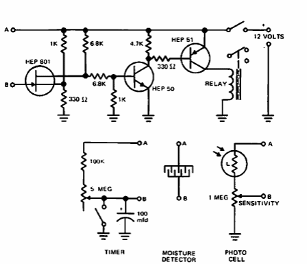 Encontrado em documentação da Motorola de 1969, este circuito, conforme o sensor e rede de tempo pode funcionar como timer, detector de umidade o fotossensor.