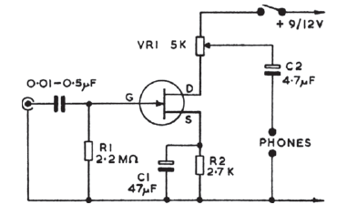 Encontramos este circuito numa publicação inglesa antiga. Qualquer JFET de uso geral pode ser usado. A saída é para fones de alta impedância, neste caso.