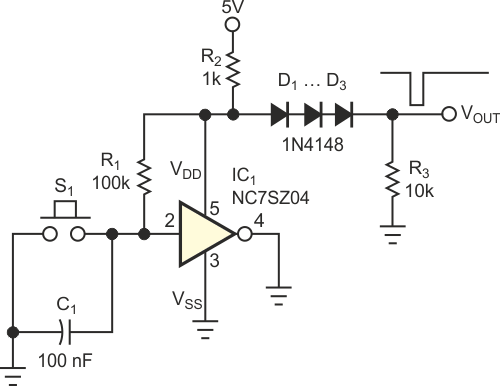 Este circuito utiliza apenas uma porta NC75Z04 da ON Semiconductor, mas pode ser implementado com funções equivalentes de outros fabricantes. O circuito fornece um sinal livre de repiques para sensores ou chaves.