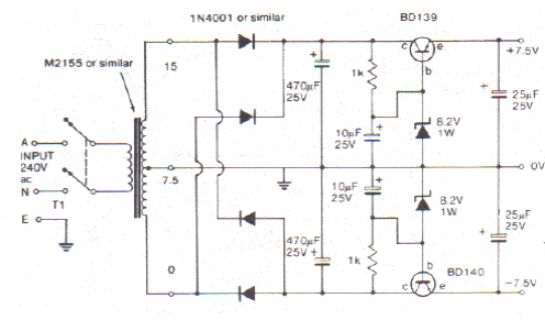 Com a troca do zener podem ser obtidas outras tensões de saída para esta fonte simétrica. Com os transistores indicados a corrente máxima é da ordem de 500 mA.