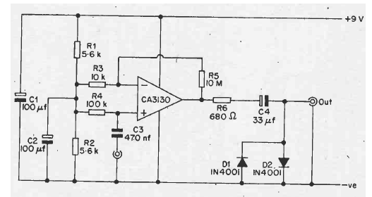 Usando um amplificador operacional CA3130, este circuito de uma documentação de 1977 pode trabalhar com sinais de baixas frequências e não necessita de fonte simétrica.