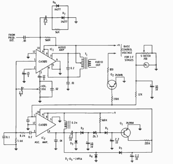 Encontramos este circuito num Radio handbook de 1977. Os componentes usados são da época. O circuito consiste num amplificador de áudio com controla automático de ganho.