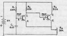 Encontramos este circuito num manual de transistores muito antigo, sendo indicado para uso com transistores de germânio. Os valores dos componentes podem ser alterados para que transistores modernos sejam usados.