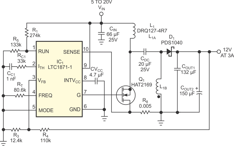 Com base no LTC3862, este circuito consiste num conversor DC-DC com capacidade de operar com tensões de entrada menor do que a desejada na saída. O MOSFET admite equivalente.