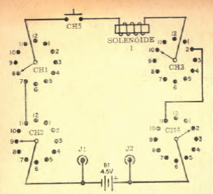 Esta simples tranca eletrônica foi encontrada numa Eletrônica Popular de junho de 1967. Ela faz uso de chaves rotativas de 12 posições, componente ainda comuns na época.