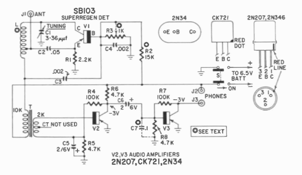 Indicado como receptor para a faixa de polícia, este circuito foi encontrado numa documentação de 1960. Na época, esta faixa era usada pela polícia. Os transistores são de germânio e o fone deve ser de alta impedância.