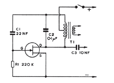 A frequência deste oscilador depende de T1 e C2. O transformador pode ser do tipo de áudio antigo. O transistor pode ser qualquer JFET de uso geral.