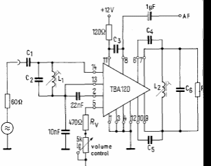Este circuito foi obtido do manual de circuitos integrados da Siemens de 1976. Trata-se do circuito de aplicação do TBA 120 como demodulador de FM.