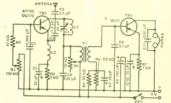 Este circuito foi encontrado numa Eletrônica Popular de abril de 1978. Os transistores são da época e L1 consiste em 4 espiras de fio 26 ou 28 com diâmetro de 1 cm sem núcleo. Os fones são de alta impedância.