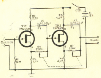 Encontrado numa Eletrônica Popular de julho/agosto de 1968, este circuito utiliza FETs de uso geral da época. O circuito pode ser elaborado com FETs modernos.