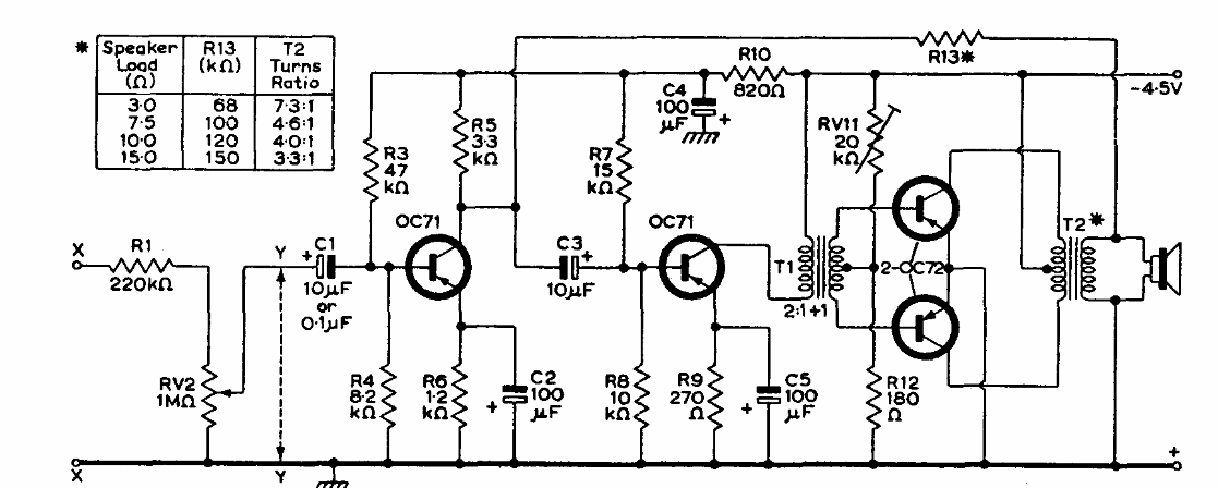 Este amplificador de 4 transistores pode funcionar com 4,5 ou 6 V. Encontramos num manual de transistores da Mullard de 1960. Os transistores são da época.