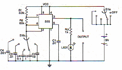 Este circuito foi obtido numa documentação da internet. O LED está invertido e a frequência depende do capacitor selecionado.
