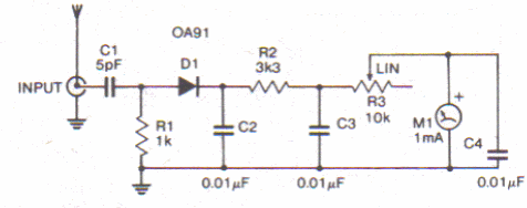 Este monitor de RF ou medidor de intensidade de campo pode usar instrumentos de 100 uA a 1 mA de fundo de escala. O diodo é de germânio.