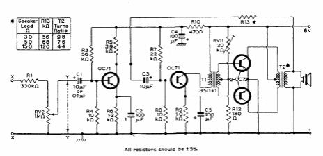 Este antigo amplificador utiliza transistores de germânio da época. O circuito é de um manual de transistores da Mullard de 1960. A alimentação é feita com 6 V.