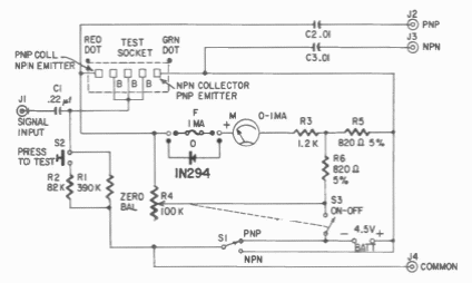 Este provador de transistores foi encontrado numa publicação de Gernsback de 1960. O circuito pode ser usado com transistores atuais.