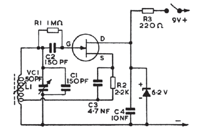 Este circuito foi encontrado numa documentação inglesa antiga. A bobina deve ser de acordo com a faixa sintonizada. O transistor pode ser qualquer JFET de uso geral.