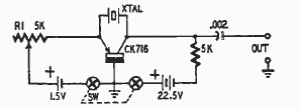 Este circuito para cristais de 100 a 500 kHz foi encontrado numa documentação americana de 1954. O transistor é de tipo antigo de germânio, como se usava na época.