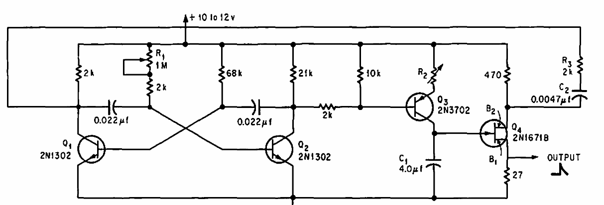 Este circuito foi encontrado numa publicação de 1967. Os transistores podem ser uso geral modernos. Os valores dos componentes podem ser alterados para outras temporizações.