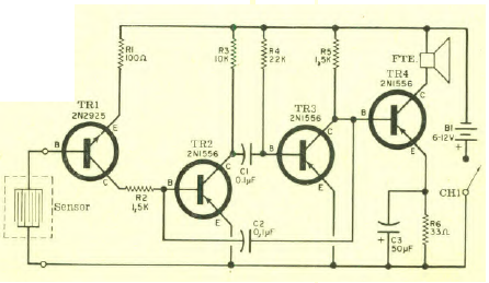 Este circuito foi encontrado numa Eletrônica Popular de novembro/dezembro de 1968. O circuito faz uso de transistores da época e deve ser alimentado somente por pilhas.