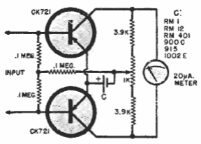 Este circuito para instrumentos analógicos foi encontrado numa documentação da Raytheon dos anos 60. Os transistores são tipos de germânio da época.