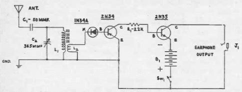 Este antigo receptor de AM usa dois transistores de germânio e tem escuta em fones magnéticos de alta impedância. O circuito é de uma documentação de 1956; L1 tem 80 espiras e L2 de 5 a 10 espiras ambas em bastão de ferrite.