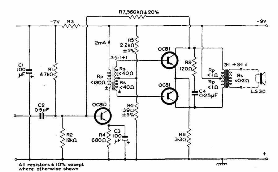 Este circuito com 1W de saída foi encontrado num manual da Mullard de 1960. O consumo é baixo e são usados transistores de germânio da época.