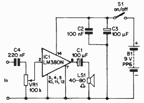 Este amplificador de 200 mW foi encontrado numa documentação antiga. Pode ser alimentado com tensões na faixa de 6 a 9 V. O circuito tem excelente sensibilidade.