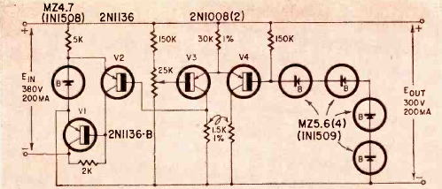 Este regulador de tensão de estado sólido para alta tensão foi apresentado na revista Radio Electronics de janeiro de 1961. Os componentes são da época.