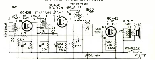 Este circuito de 3 transistores era colocado dentro de uma boneca como indica o texto da revista Radio Electronics de dezembro de 1962. O circuito sintonizava a faixa de ondas médias e tinha saída em alto-falante.