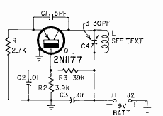 Este circuito de uma Radio Electronics de março de 1964 utiliza um transistor de RF da época. Pode ser montado com os atuais BF494 ou equivalentes. A bobina consta de 4 espiras de fio de 22 a 26 com diâmetro de 1 cm sem núcleo. Ele originalmente joga o sinal no televisor analógico por um processo de intermodulação.