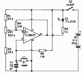 Este circuito aciona um LED, mas pode ser modificado para acionar um relé, O tempo é ajustado em VR1 e a alimentação pode ser feita por outras tensões, dentro da faixa admitida pelo operacional.