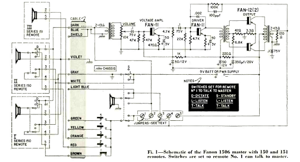Este intercomunicador transistorizado comercial teve este diagrama publicado na revista Radio Electronics de agosto de 1960. O circuito tem diversos ramais e dá os modos de ligação.