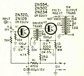 Este circuito de 5 W de potência com apenas dois transistores foi publicado na revista Radio Electronics de julho de 1961. O circuito é alimentado por fonte ou bateria de 12 V.
