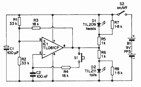 Este circuito usa um amplificador operacional que ainda é comum em nossos dias. A indicação é feita por LED e a alimentação pode ser alterada para valores entre 6 e 12 V.