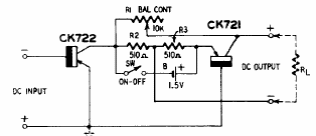 Esta configuração dos anos 50 possui um controle de balanço. Os transistores são tipos de germânio da época e a corrente é muito baixa com máximo de 1 mA.