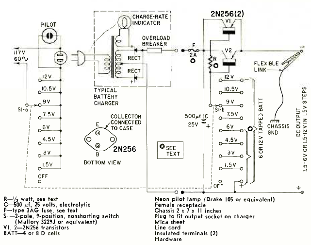 Esta fonte de alimentação de bancada com diversas tensões de saída de 1,5 a 12 V foi encontrada na revista Radio Electronics de agosto de 1960. O circuito usa transistores de potência da época.