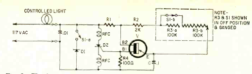 Este dimmer com transistor unijunção e SCR saiu na revista Radio Electronics de março de 1962. Os diodos de quatro camadas e os transistores unijunção estavam aparecendo no mercado nessa época.