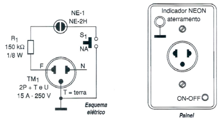 A finalidade deste circuito é indicar como se encontra o aterramento de uma tomada tripolar, usando para essa finalidade uma lâmpada néon de baixíssimo consumo. O circuito funciona com 110/220 V e, pelo brilho da lâmpada temos uma ideia de como se encontra o aterramento (100% para o brilho máximo). Basta apertar o interruptor por um instante para verificar o aterramento.