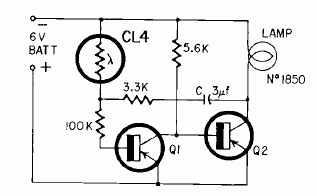 Este circuito publicado na revista Radio Electronics de novembro de 1964 alimenta uma lâmpada, mas pode funcionar com LEDs de alta potência. A frequência é dada pelo capacitor. O circuito dispara com a ausência de luz no sensor.