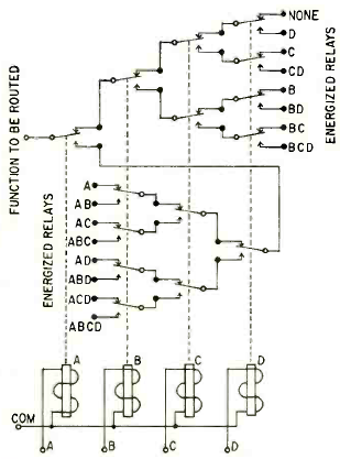 Este circuito consiste num rearranjo do circuito anterior também usando 4 relés. Encontramos esta configuração de automatismo digital numa revista Radio Electronics de outubro de 1961.