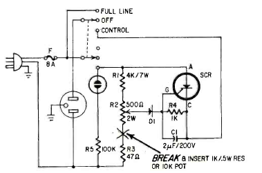 Este circuito com SCR é de uma revista Radio Electronics de setembro de 1965. Trata-se de um controle comercial da Heathkit para controle de motores universais.