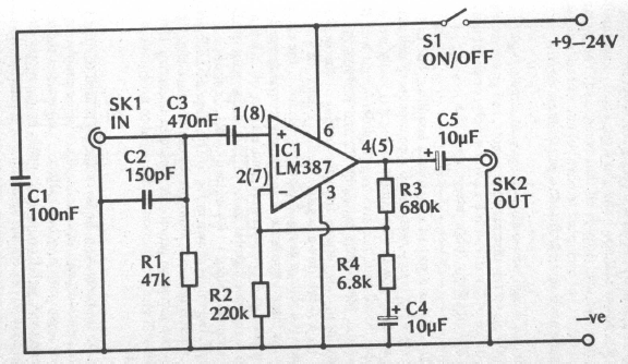 Encontramos este circuito numa documentação inglesa de 1989. O circuito integrado usado não é muito comum atualmente. O circuito não necessita de fonte simétrica.