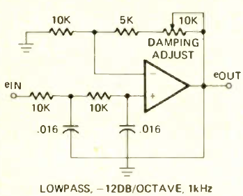 Esta configuração básica de filtro usando amplificador operacional foi encontrada na revista Radio Electronics de julho de 1975. Os componentes podem ser alterados para outros frequências. A rejeição é de 130 dB por oitava. Pode ser usado o 741.