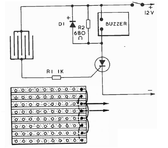 Este circuito foi encontrado numa documentação antiga. O SCR pode ser qualquer da família 106. Observe o sensor feito em uma plaquinha universal.