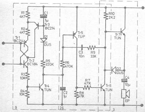 Com este nome, a publicação inglesa onde encontramos este circuito indicou um detector de toque sensível. O circuito pode usar transistores atuais equivalentes e o acionamento é um buzzer.