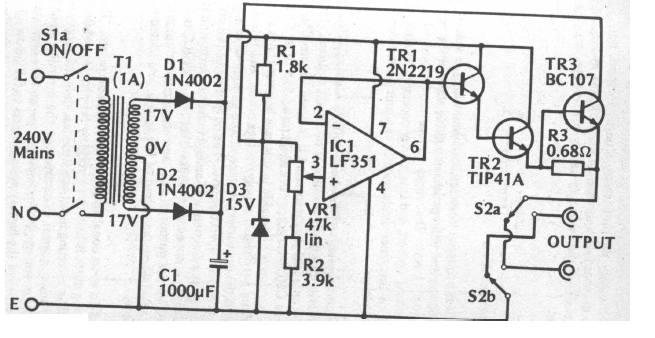 Este circuito de controle para ferrovias em miniatura foi encontrado numa documentação inglesa dos anos 80. O circuito integrado é um amplificador operacional.
