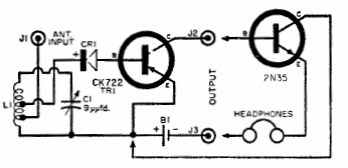 Este receptor dos anos 50 inclui uma etapa amplificadora com transistor complementar ao CK722, no caso o 2N35. O fone deve ser de alta impedância.